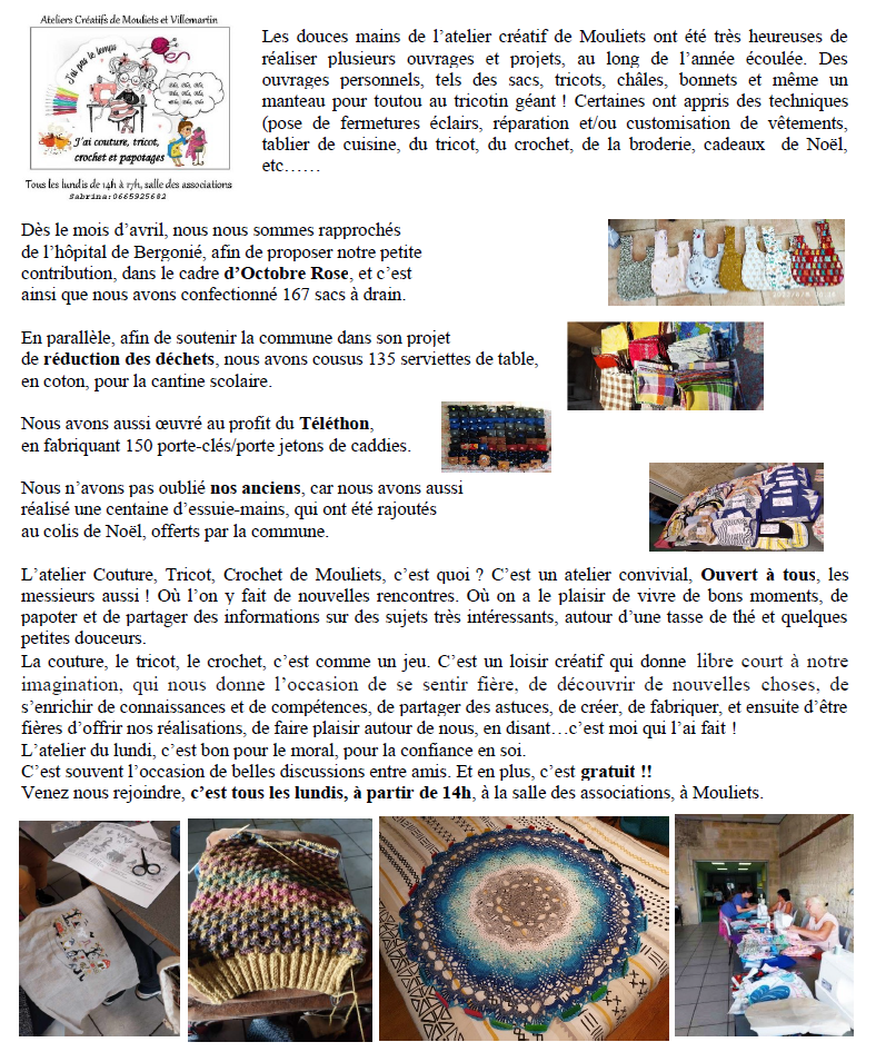 L’atelier créatif de Mouliets est une asso loi 1901, créée pour lutter contre l’exclusion rurale, en proposant des ateliers interactifs, dans la bienveillance et le partage.