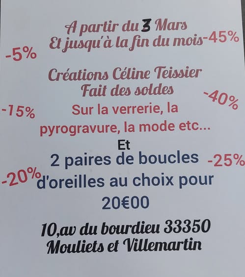 A partir du 3 mars et jusqu’à la fin du mois la boutique Créations Céline Teissier fait des soldes.